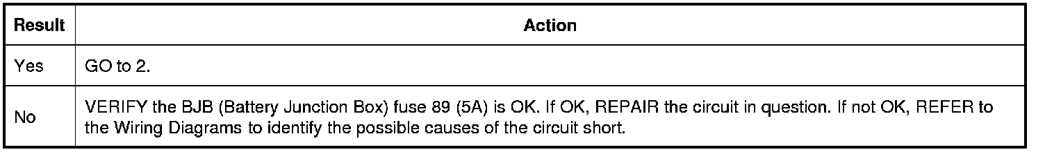 Verify BJB (Battery Junction Box) fuse 89 (5A) is OK.