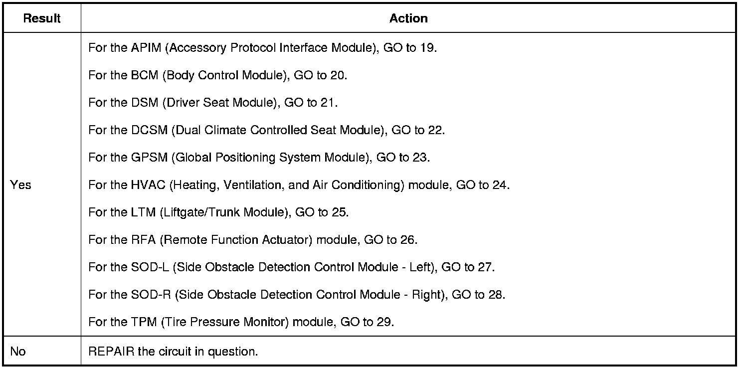15. CHECK FOR RESTORED NETWORK COMMUNICATION WITH THE SOD-L (Side Obstacle Detection Control Module - Left), SOD-R (Side Obstacle Detection Control Module - Right), HVAC (Heating, Ventilation, and Air Conditioning) MODULE, DCSM (Dual Climate Controlled Seat Module), AND THE LTM (Liftgate/Trunk Module) DISABLED