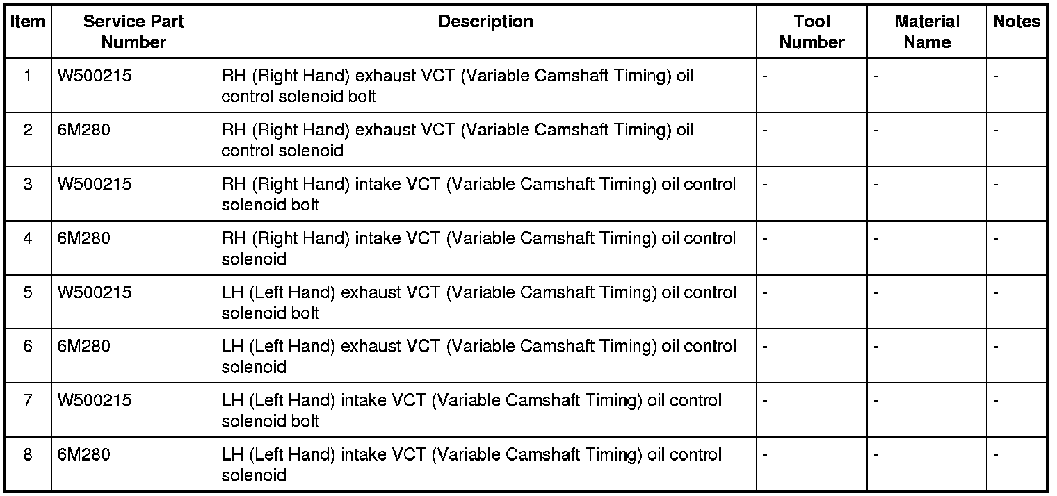 1. NOTE: The VCT (Variable Camshaft Timing) oil control solenoid bolt must be tightened in 2 stages.