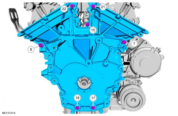 Install the engine front cover and bolts 7, 8, 15, 17, 18, 21 and 22.