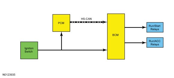 When the BCM (Body Control Module) receives the START voltage input from the ignition switch it activates the RUN/START bus and the RUN/START relay, providing ignition power to the various vehicle systems and modules. The BCM (Body Control Module) also sends out the ignition mode message on the MS-CAN (Medium Speed Controller Area Network) and the HS-CAN (High Speed Controller Area Network).