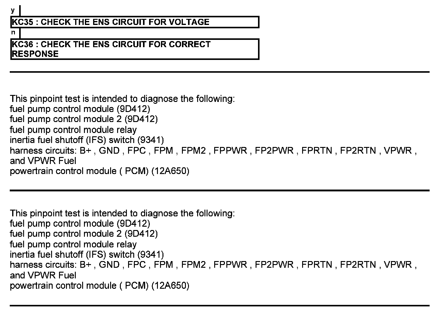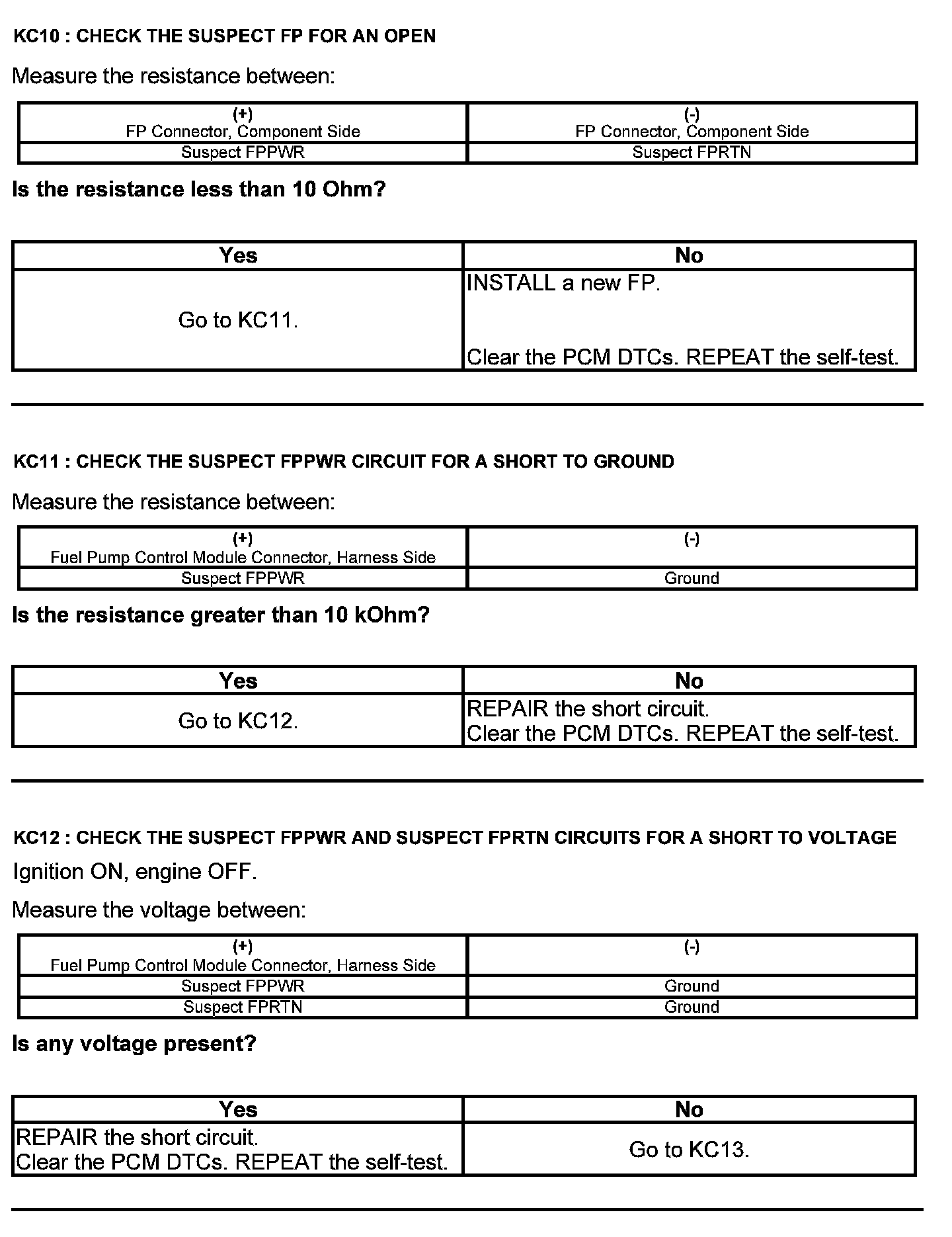 Home >> Ford >> 2012 >> F 150 2WD V6-3.7L >> Repair and Diagnosis >> Powertrain Management >> Computers and Control Systems >> Testing and Inspection >> Pinpoint Tests >> Test KC: Fuel Pump Control Module