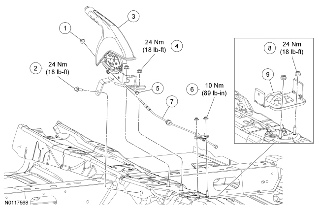 NOTICE: Use care when releasing the RH rear parking brake cable from the plastic brackets or damage to the brackets may occur.