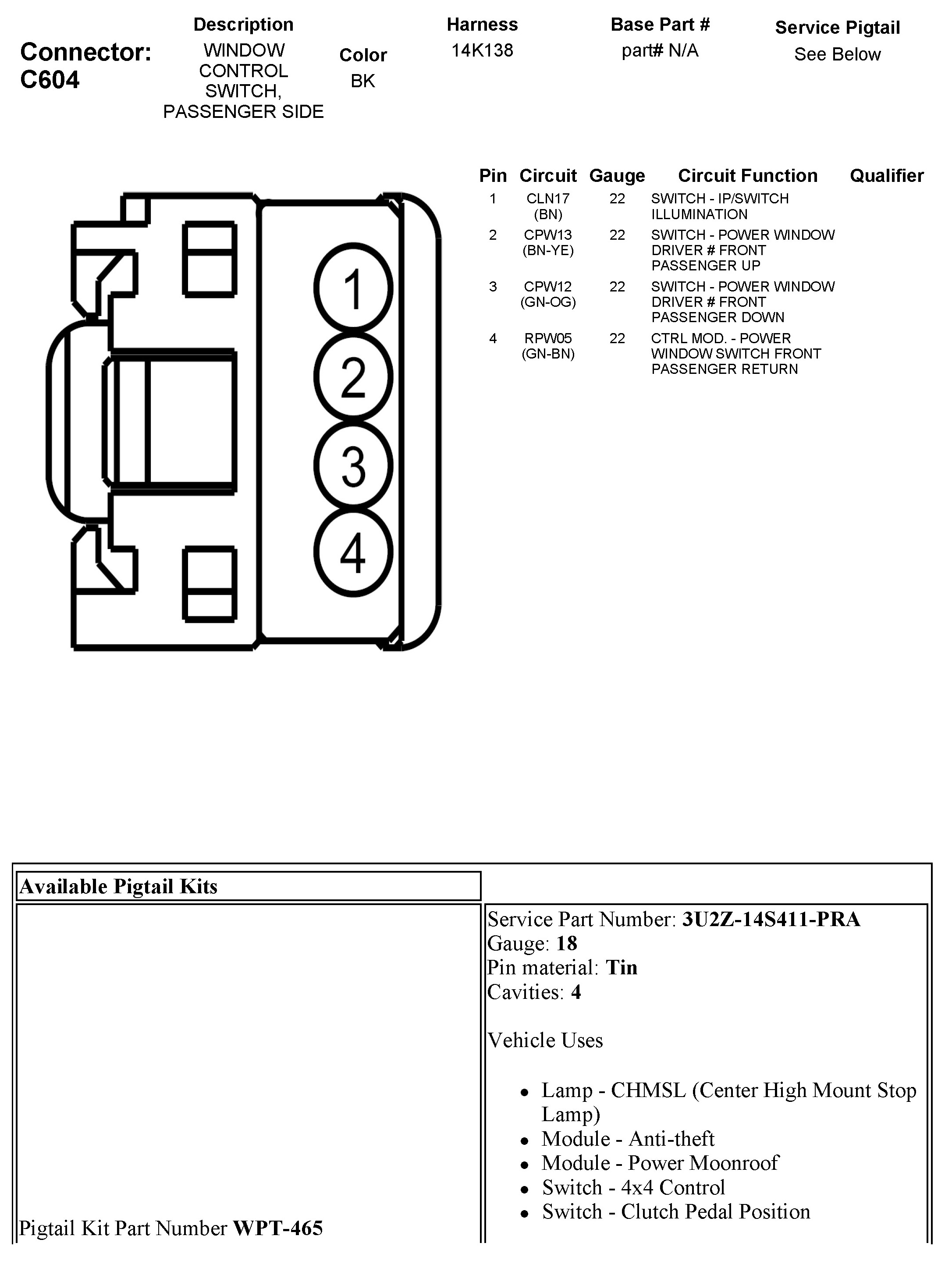 C604 Window Control Switch, Passenger Side