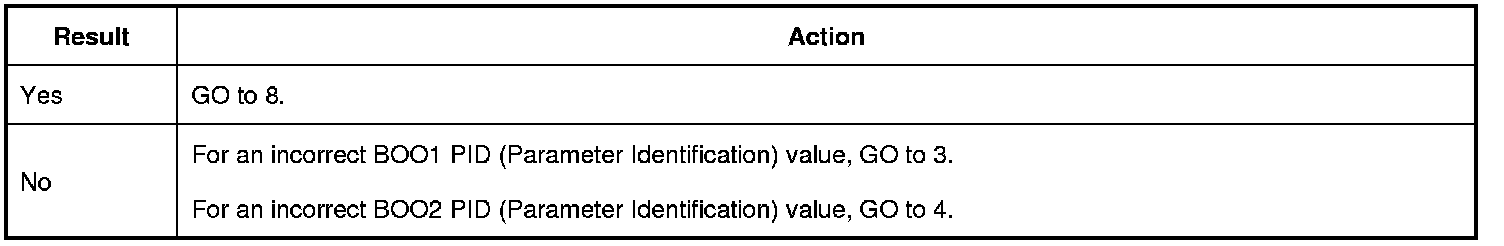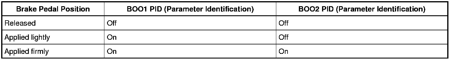 2. Using the table, monitor the PIDs (Parameter Identifications) BOO1 (stoplamp switch) and BOO2 (cruise control deactivator switch) while applying and releasing the brake pedal.