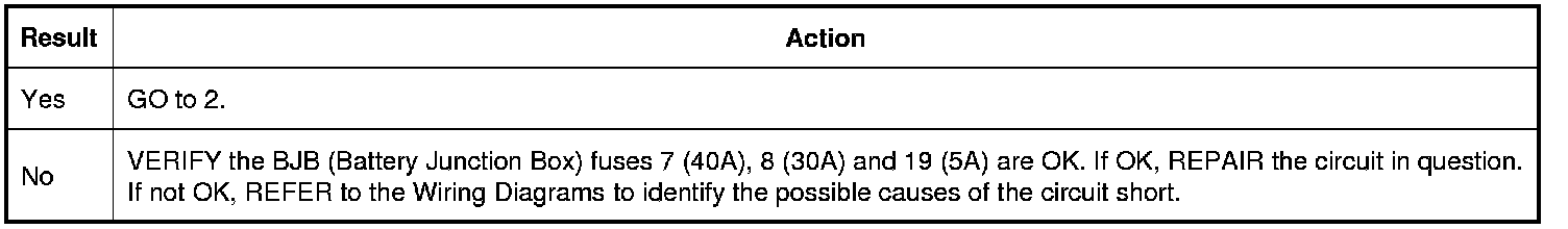 Verify BJB (Battery Junction Box) fuses 7 (40A), 8 (30A) and 19 (5A) are OK.