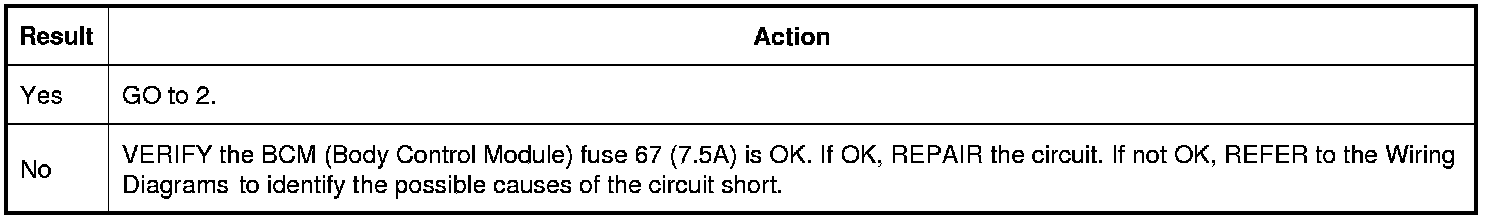 Verify BCM (Body Control Module) fuse 67 (7.5A) is OK.