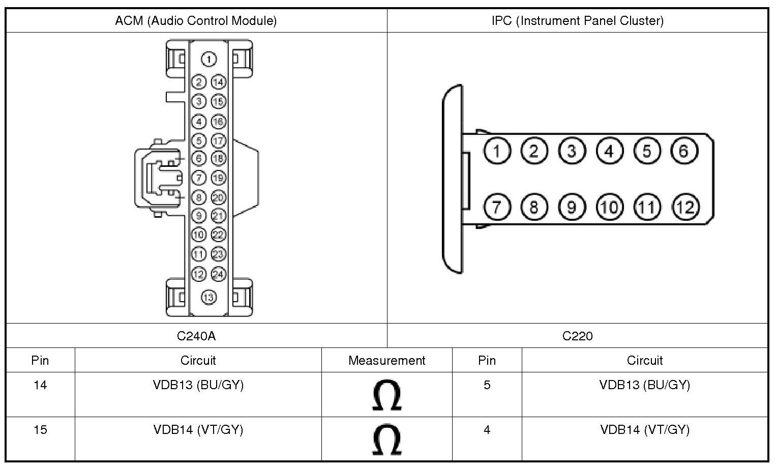5. CHECK THE I-CAN (Infotainment Controller Area Network) CIRCUITS BETWEEN THE ACM (Audio Control Module) AND THE IPC (Instrument Panel Cluster) FOR AN OPEN