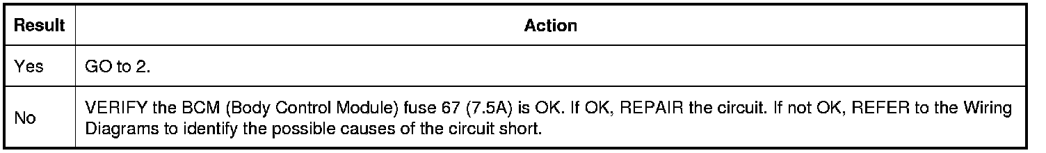 Verify BCM (Body Control Module) fuse 67 (7.5A) is OK.