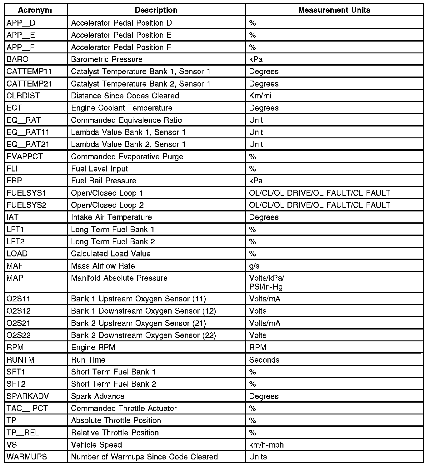 Freeze frame data allows access to emission related values from specific generic parameter identification (PID). These values are stored when an emission related diagnostic trouble code (DTC) is stored in continuous memory. This provides a snapshot of the conditions that were present when the DTC was stored. Once one set of freeze frame data is stored, this data remains in memory even if another emission related DTC is stored, with the exception of misfire or fuel system DTCs. Once freeze frame data for a misfire or fuel system DTC is stored it overwrites any previous data, and freeze frame data is no longer overwritten. When a DTC associated with the freeze frame data is erased or the DTCs are cleared, new freeze frame data can be stored again. In the event of multiple emission related DTCs in memory, always note the DTC for the freeze frame data.