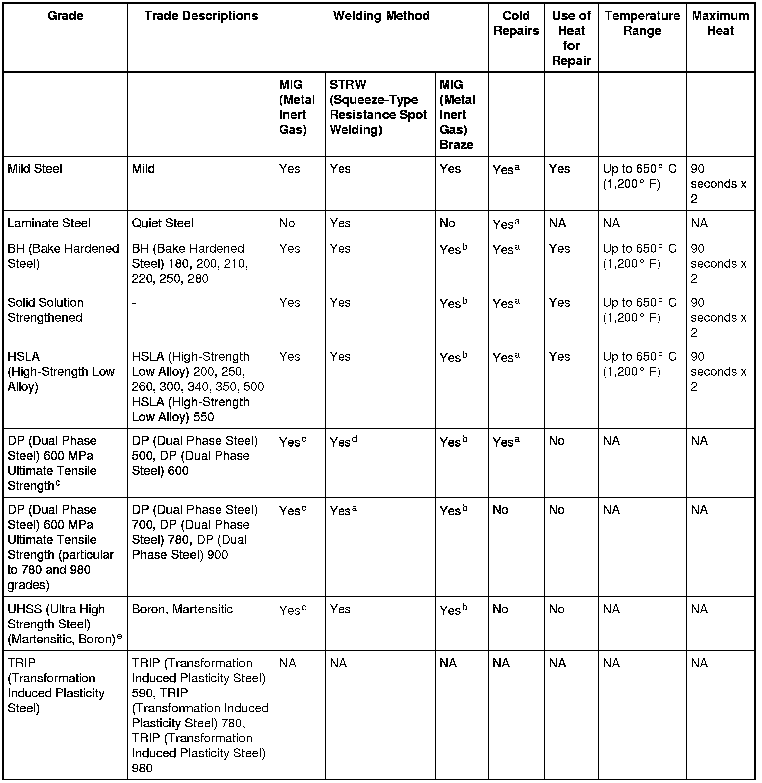 d For DP 980 and Boron use MIG (Metal Inert Gas) plug welding only, no stitch welding.
