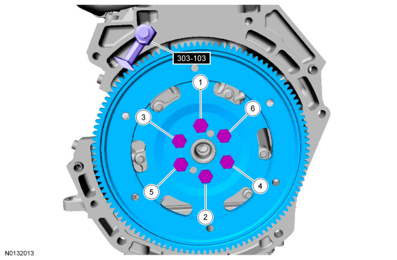 Install the flexplate, the 6 new bolts and the 303-103 (T74P-6375-A).