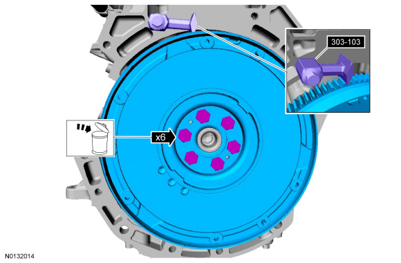 Install the flywheel, the 6 new bolts and the 303-103 (T74P-6375-A).