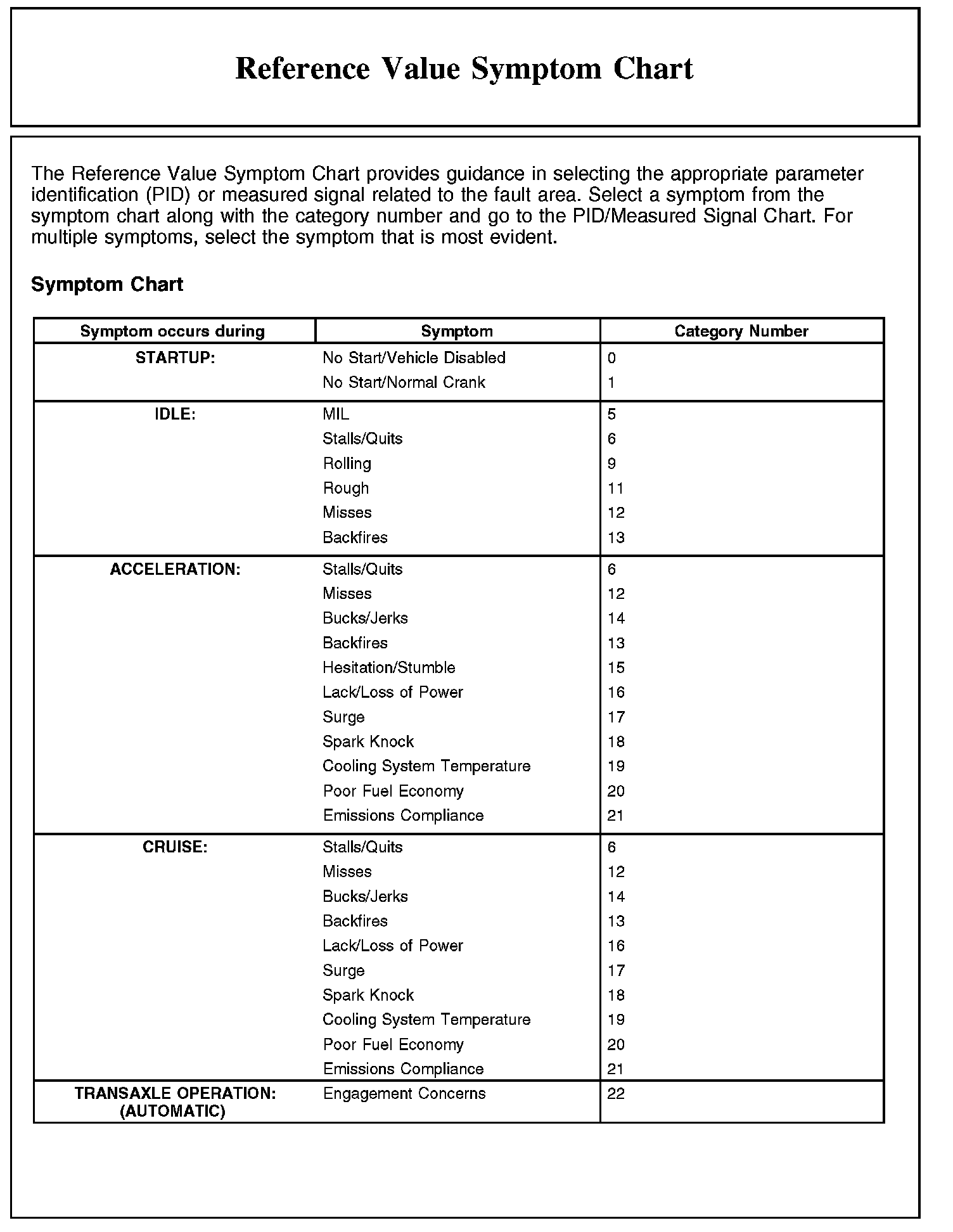 REFERENCE VALUE SYMPTOM CHART