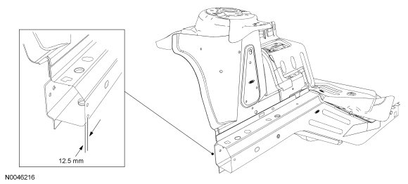 12. Measure 12.5 mm (0.49 in) forward from the lower rail cutline. Drill nine 8 mm (0.31 in) holes in the new lower side member for attachment of the insert.