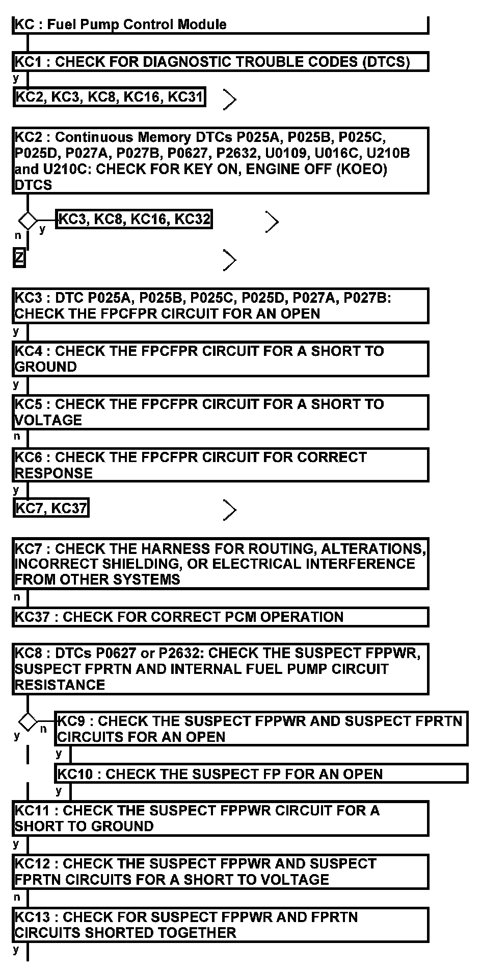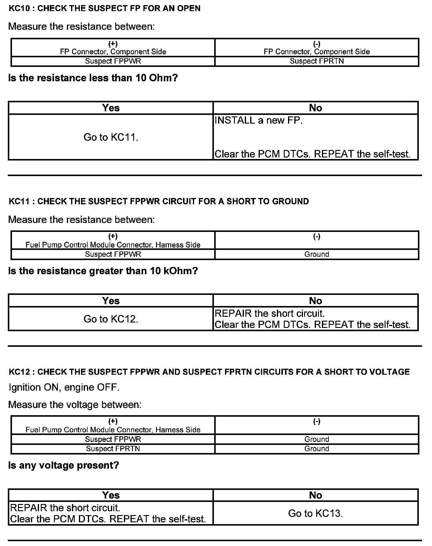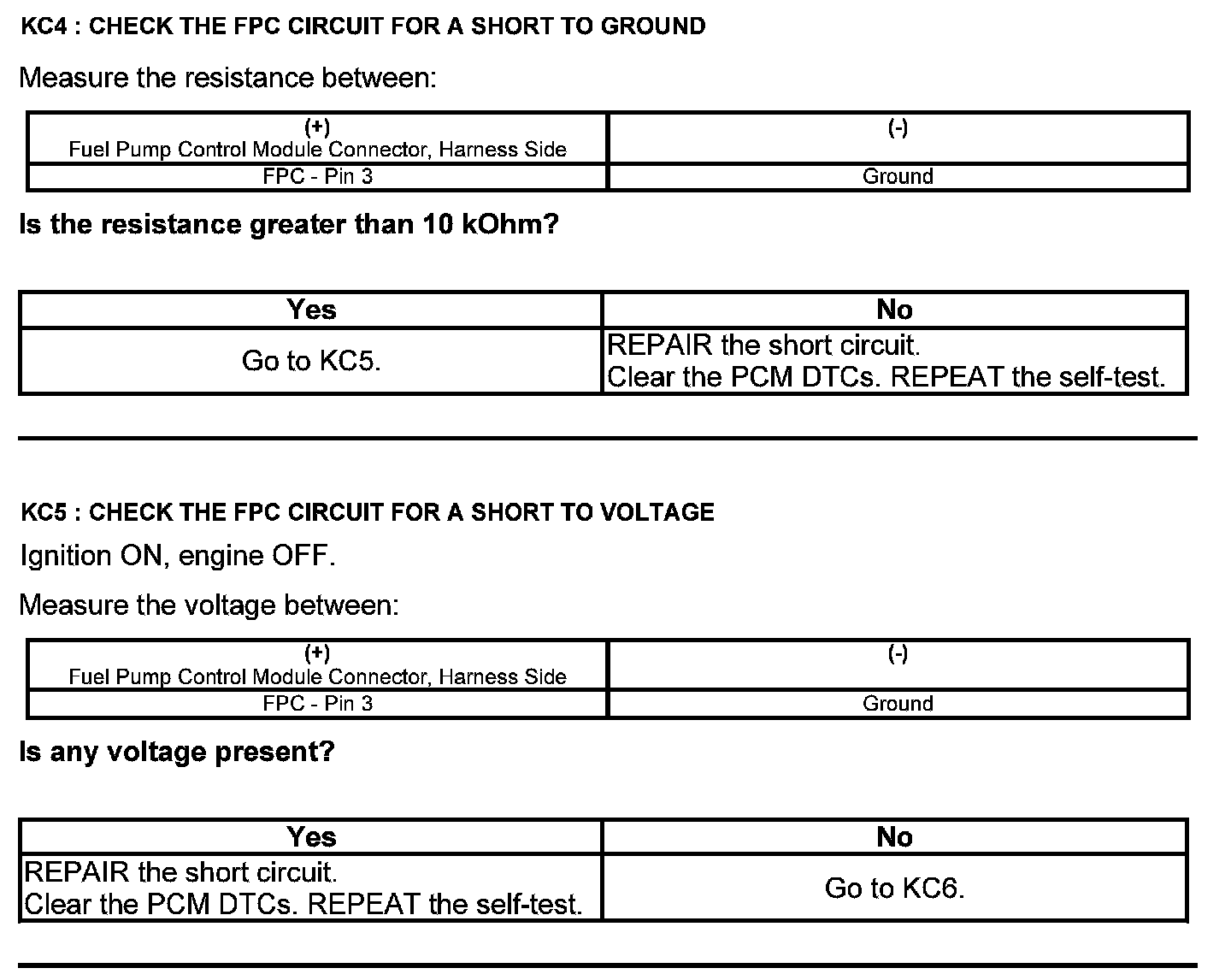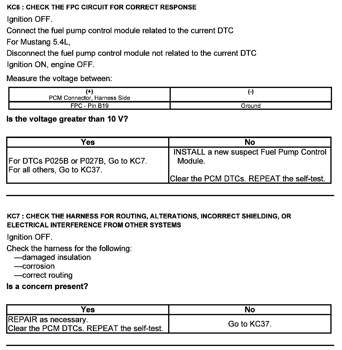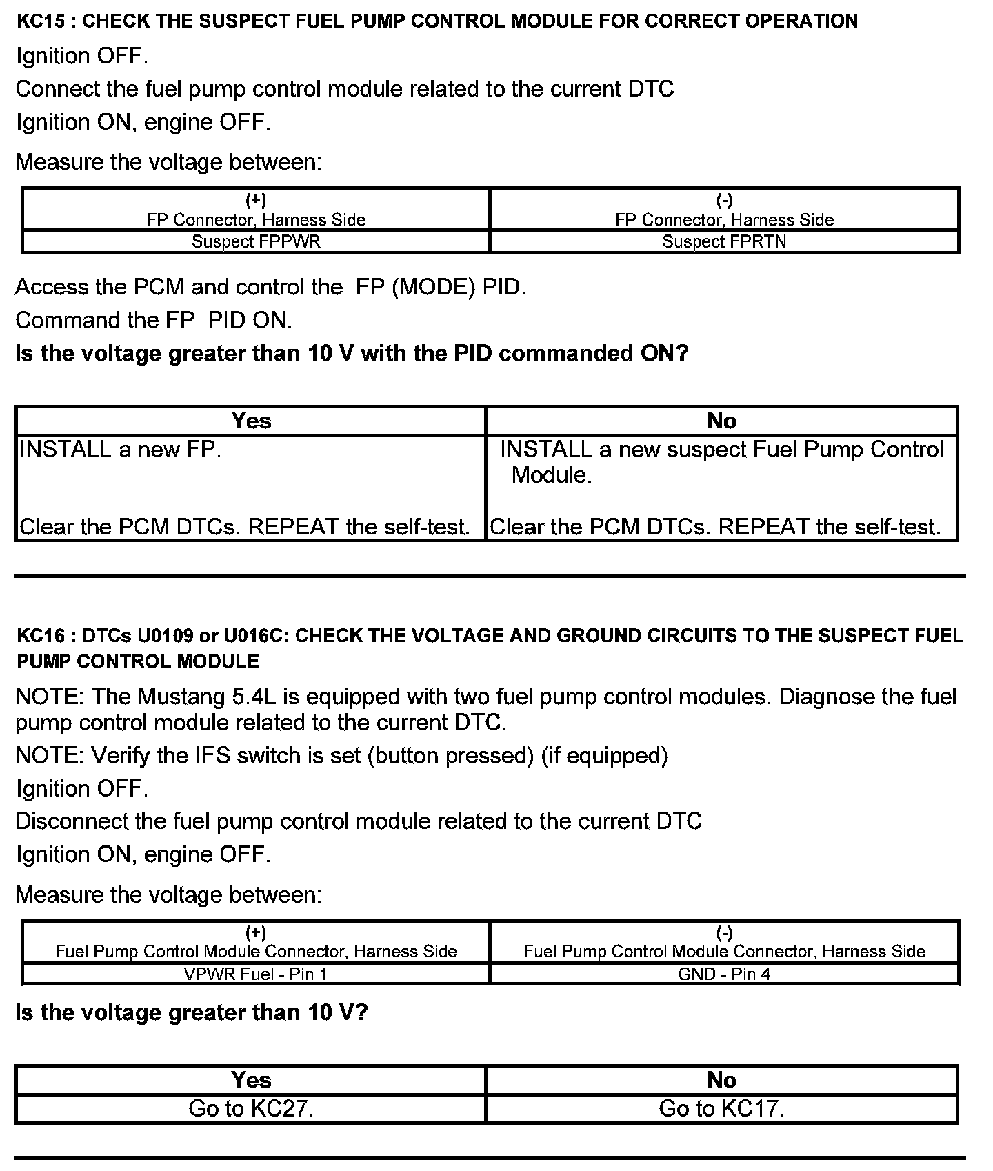 Home >> Ford >> 2012 >> Mustang V8-5.0L VIN F >> Repair and Diagnosis >> Powertrain Management >> Computers and Control Systems >> Testing and Inspection >> Pinpoint Tests >> Test KC: Fuel Pump Control Module