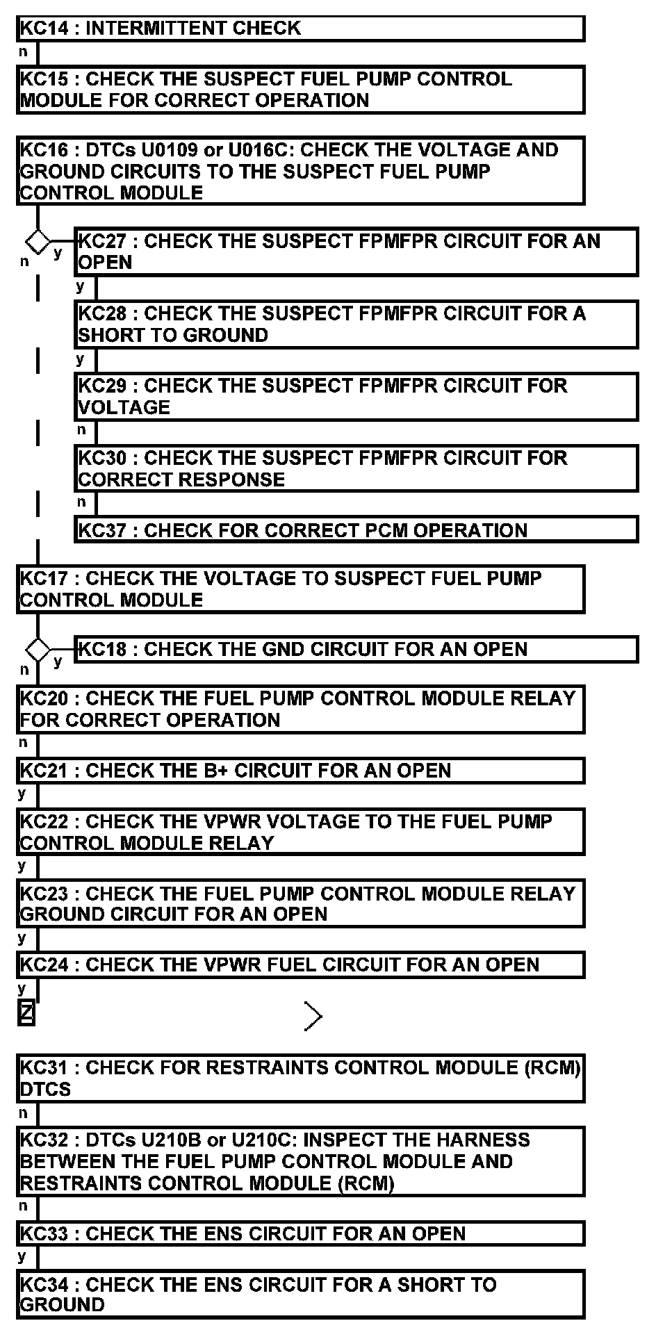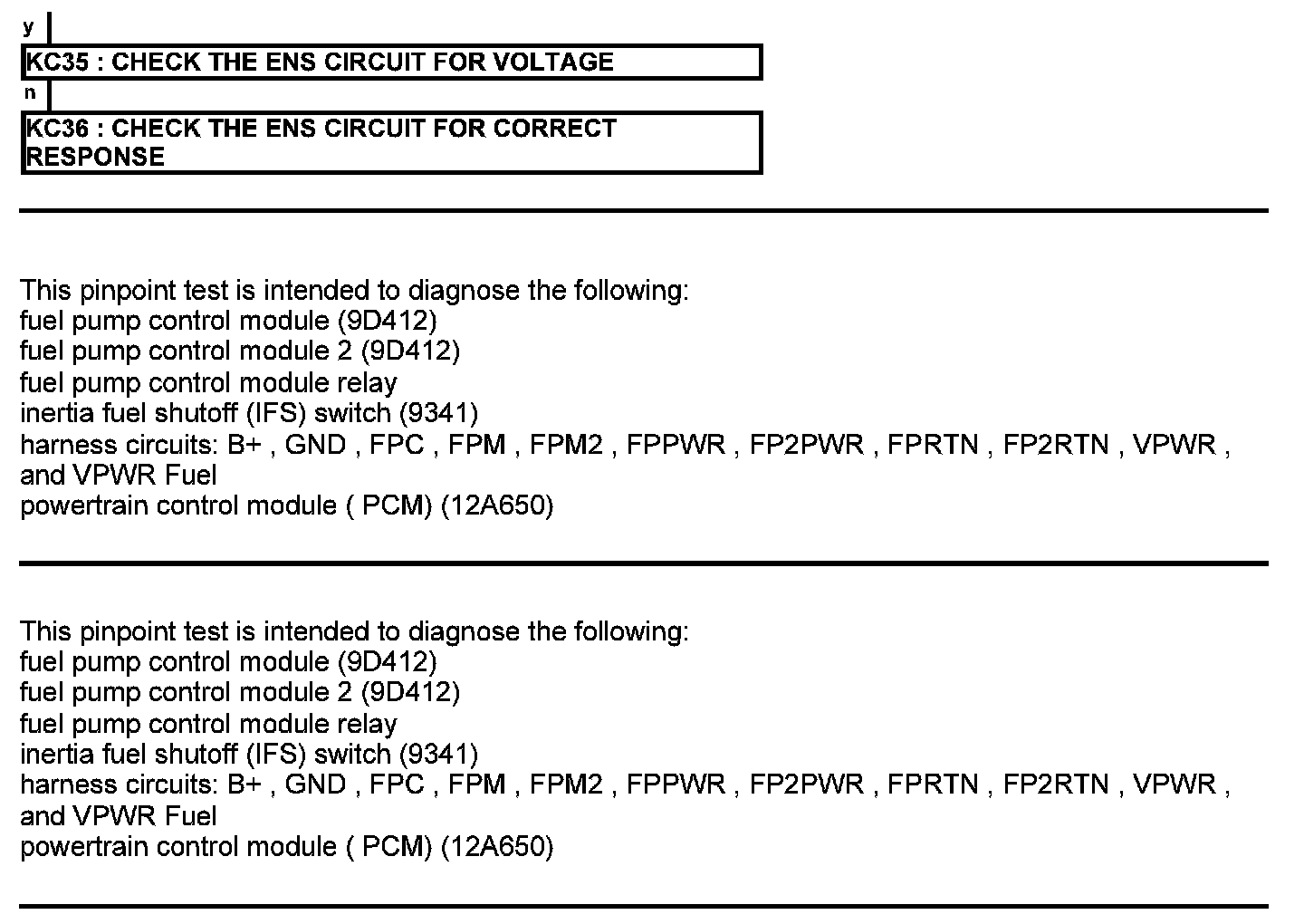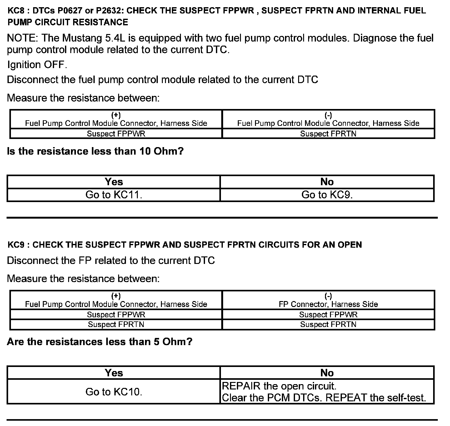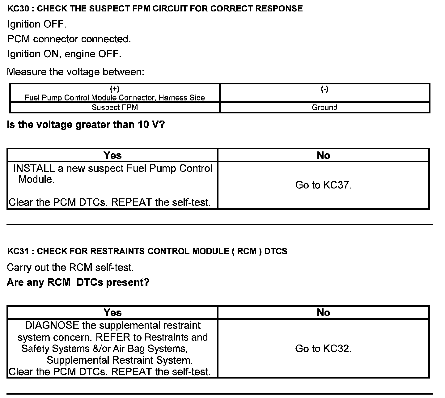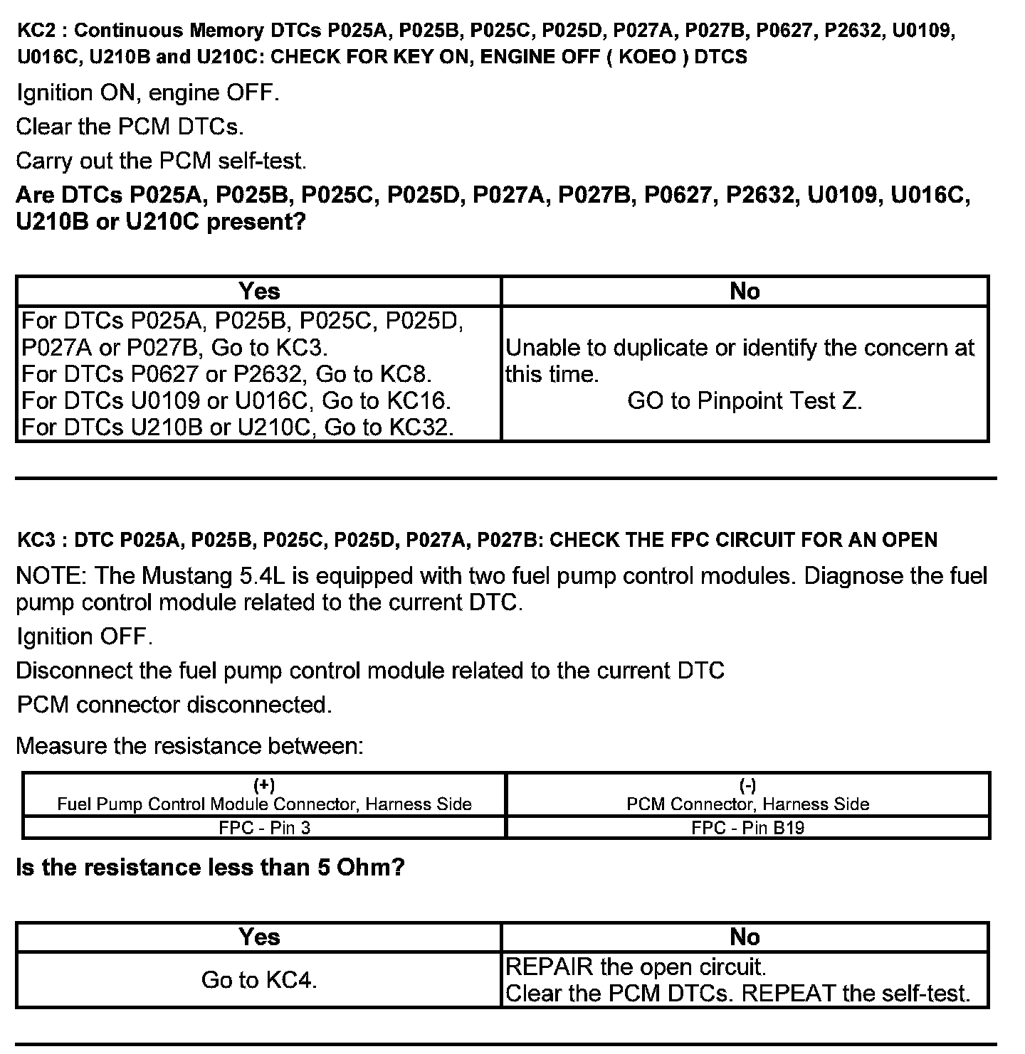 Home >> Ford >> 2012 >> Mustang V8-5.0L VIN F >> Repair and Diagnosis >> Powertrain Management >> Computers and Control Systems >> Testing and Inspection >> Pinpoint Tests >> Test KC: Fuel Pump Control Module