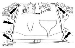 4. Remove the 2 RH lower pin-type retainers from the engine splash shield and position the shield aside.