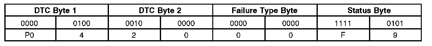 Like all digital signals, DTCs are sent to the scan tool as a series of 1s and 0s. Each DTC is made up of 2 data bytes, each consisting of 8 bits that can be set to 1 or 0. In order to display the DTCs in the conventional format, the data is decoded by the scan tool to display each set of 4 bits as a hexadecimal number (0 to F). For example, P0420 Catalyst System Efficiency Below Threshold (Bank 1).