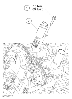 2. Remove the bolt and the Variable Camshaft Timing (VCT) oil control solenoid.