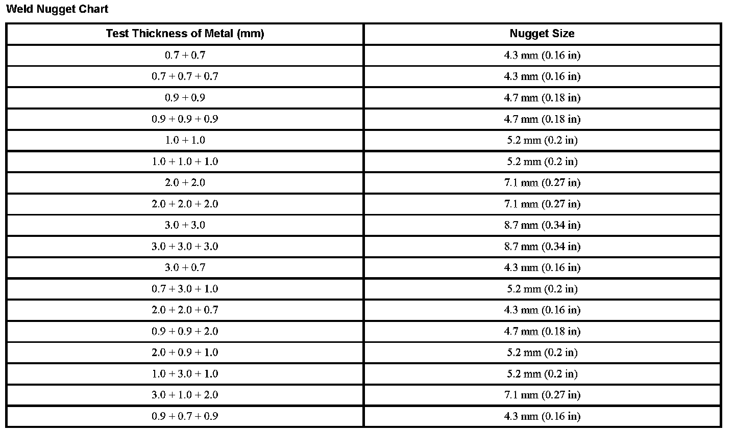 Weld Nugget Chart