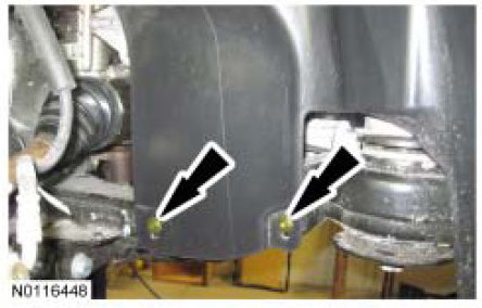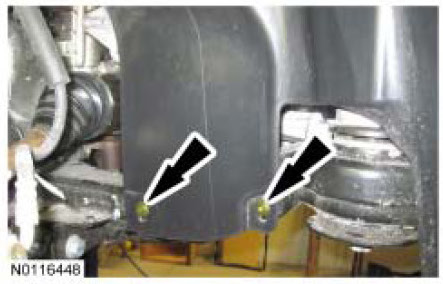 Remove the 2 RH and 2 LH lower pin-type retainers from the engine splash shields and position the shields aside.