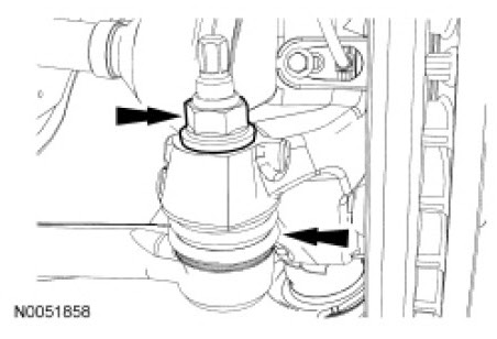 9. NOTICE: Use care when releasing the lower arm and knuckle into the resting position or damage to the ball joint seal or CV boot may occur.