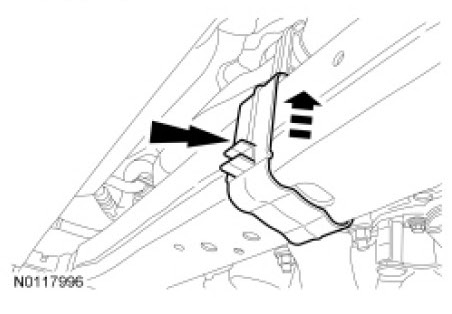 15. If equipped, unlatch the cooler hose retainer latch. Pry up on the oil cooler hose retainer to release the retainer and remove it from the subframe.