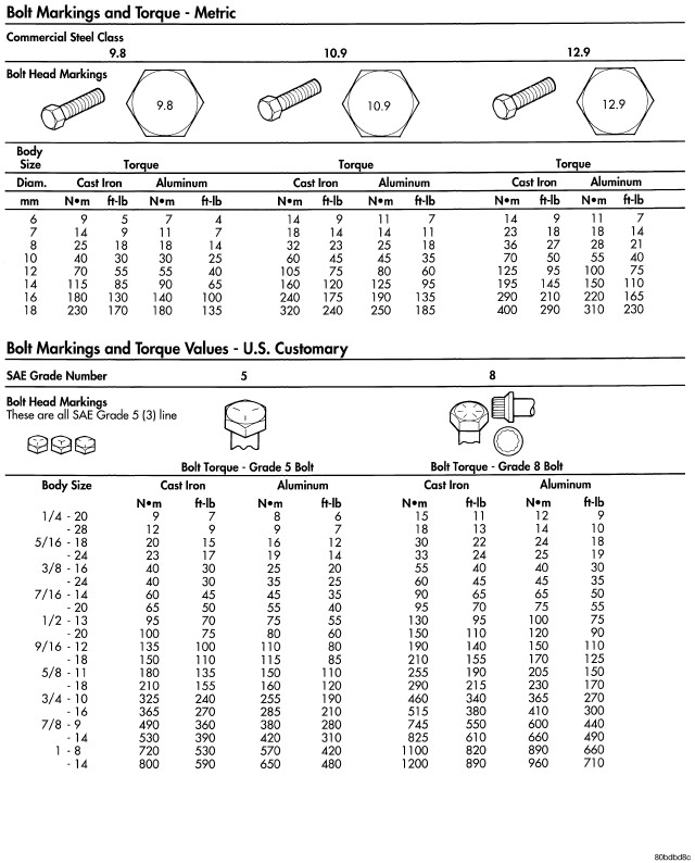 The SAE bolt strength grades range from grade 2 to grade 8. The higher the grade number, the greater the bolt strength. Identification is determined by the line marks on the top of each bolt head. The actual bolt strength grade corresponds to the number of line marks plus 2. The most commonly used metric bolt strength classes are 9.8 and 10.9. The metric strength class identification number is imprinted on the head of the bolt. The higher the class number, the greater the bolt strength. Some metric nuts are imprinted with a single-digit strength class on the nut face. Refer to the Fastener Identification and Fastener Strength Charts.