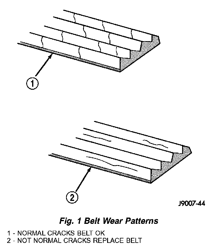 When diagnosing serpentine accessory drive belts, small cracks that run across the ribbed surface of the belt from rib to rib (Fig. 1), are considered normal. These are not a reason to replace the belt. However, cracks running along a rib (not across) are not normal. Any belt with cracks running along a rib must be replaced (Fig. 1). Also replace the belt if it has excessive wear, frayed cords or severe glazing.
