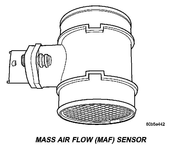 The ECM uses the mass air flow (MAF) sensor to measure air density. The temperature resistor located at the front of the MAF sensor measures the temperature of the inlet air. By varying the voltage, the electronic circuit regulates the temperature of the heating resistor in the rear so that it is 320° F (160° C) higher than the temperature of the intake air. The temperature at the heating resistor is measured by a sensor resistor in-between.