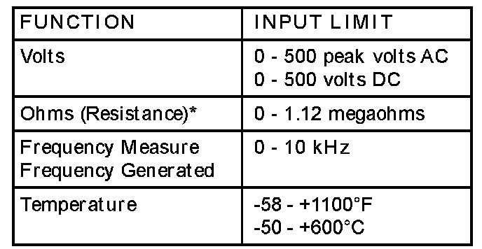 *Ohms cannot be measured if voltage is present. Ohms can be measured only on a non-powered circuit.