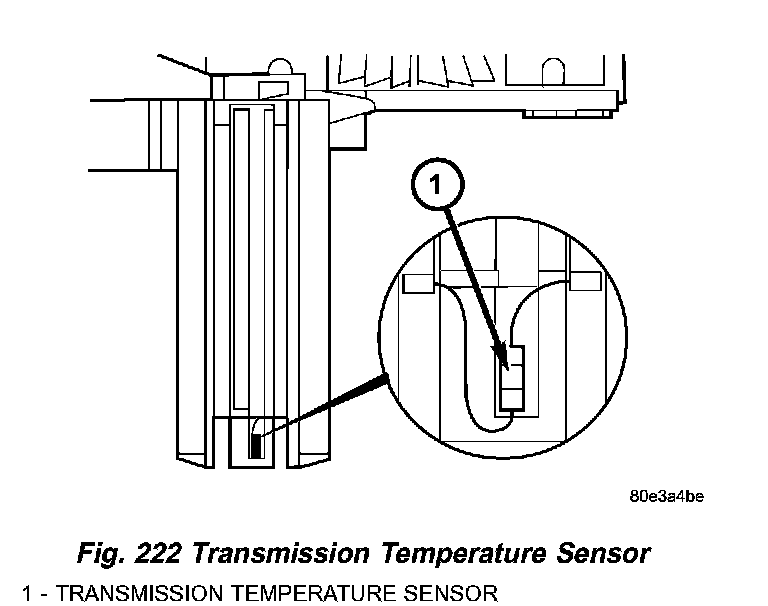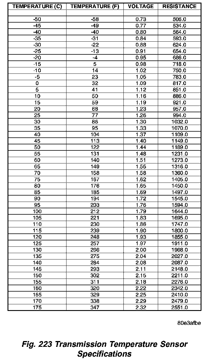 Refer to the Transmission Temperature Sensor Specifications table (Fig. 223) for the relationship between transmission temperature, sensor voltage, and sensor resistance.