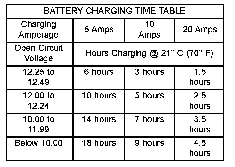The Battery Charging Time Table gives an indication of the time required to charge a typical battery at room temperature based upon the battery state-of-charge and the charger capacity.