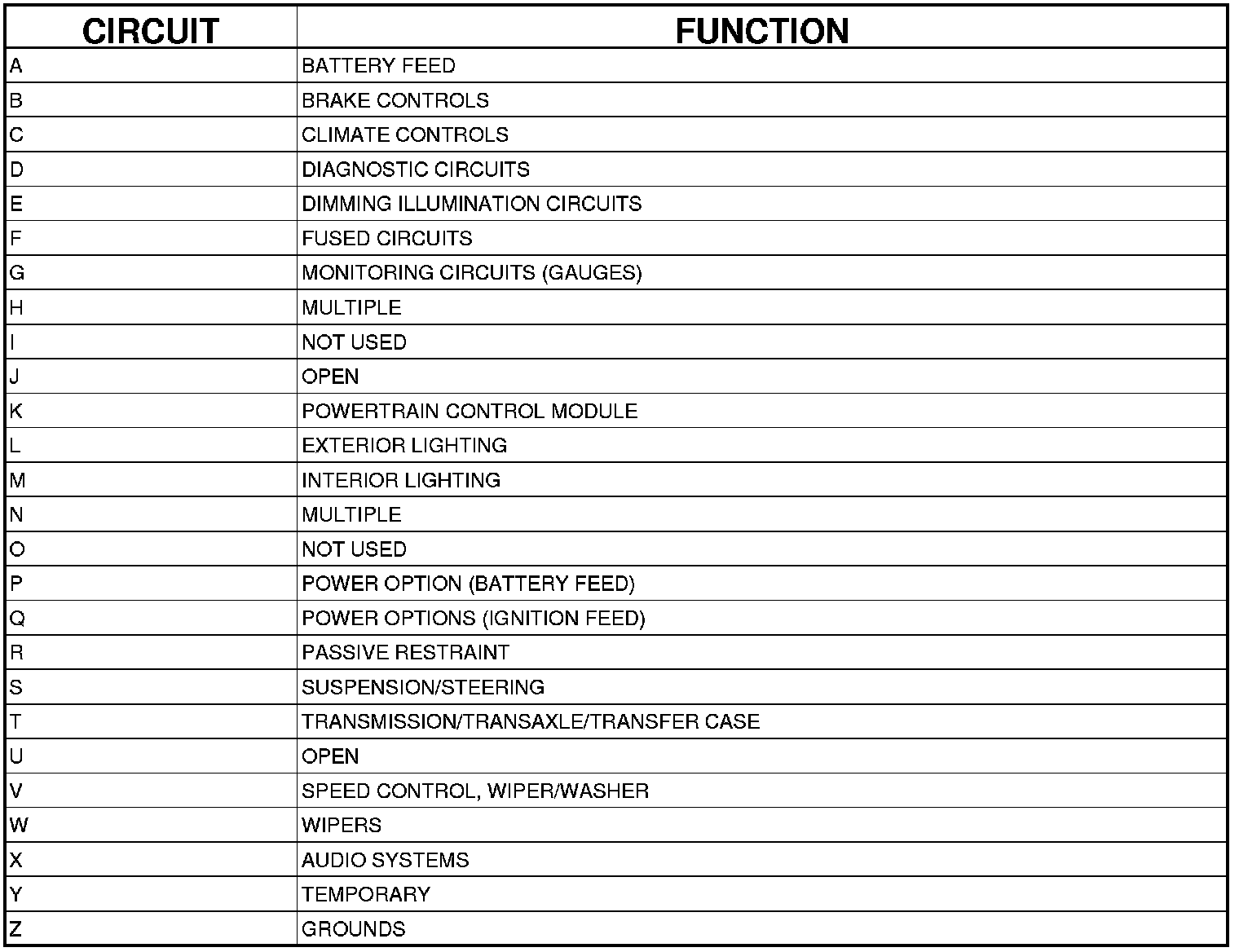 All circuits in the diagrams use an alpha/numeric code to identify the wire and it's function. To identify which circuit code applies to a system, refer to the Circuit Identification Code Chart. This chart shows the main circuits only and does not show the secondary codes that may apply to some models.