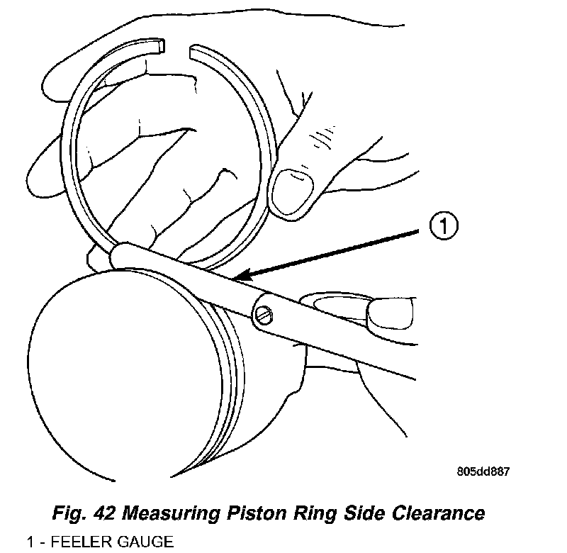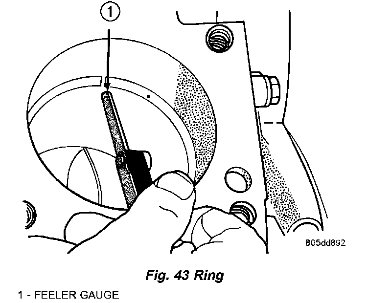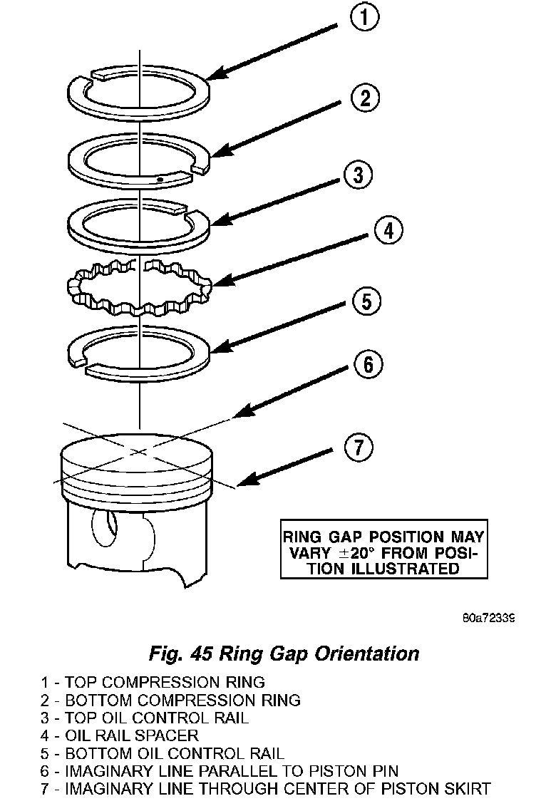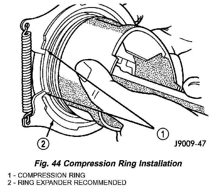 Using a ring expander, install compression rings with manufactures designation pointing toward piston crown (Fig. 44).