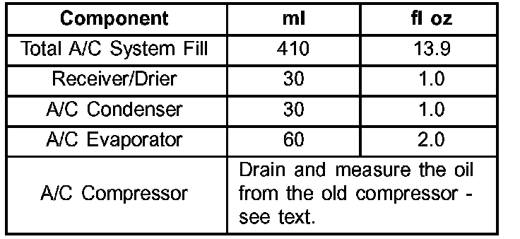 Refrigerant oil must be added when a receiver/ drier, A/C evaporator, or A/C condenser are replaced. See the Refrigerant Oil Capacities chart. When an A/C compressor is replaced, the refrigerant oil must be drained from the old compressor and measured. Drain all of the refrigerant oil from the new compressor, then fill the new compressor with the same amount of refrigerant oil that was drained out of the old compressor.