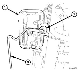 6. Rotate clip (2) to release float rod (3) from fuel level sensor (1).