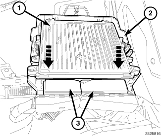 2. Carefully push down on the PCM (1) to seat it into the bracket (2).