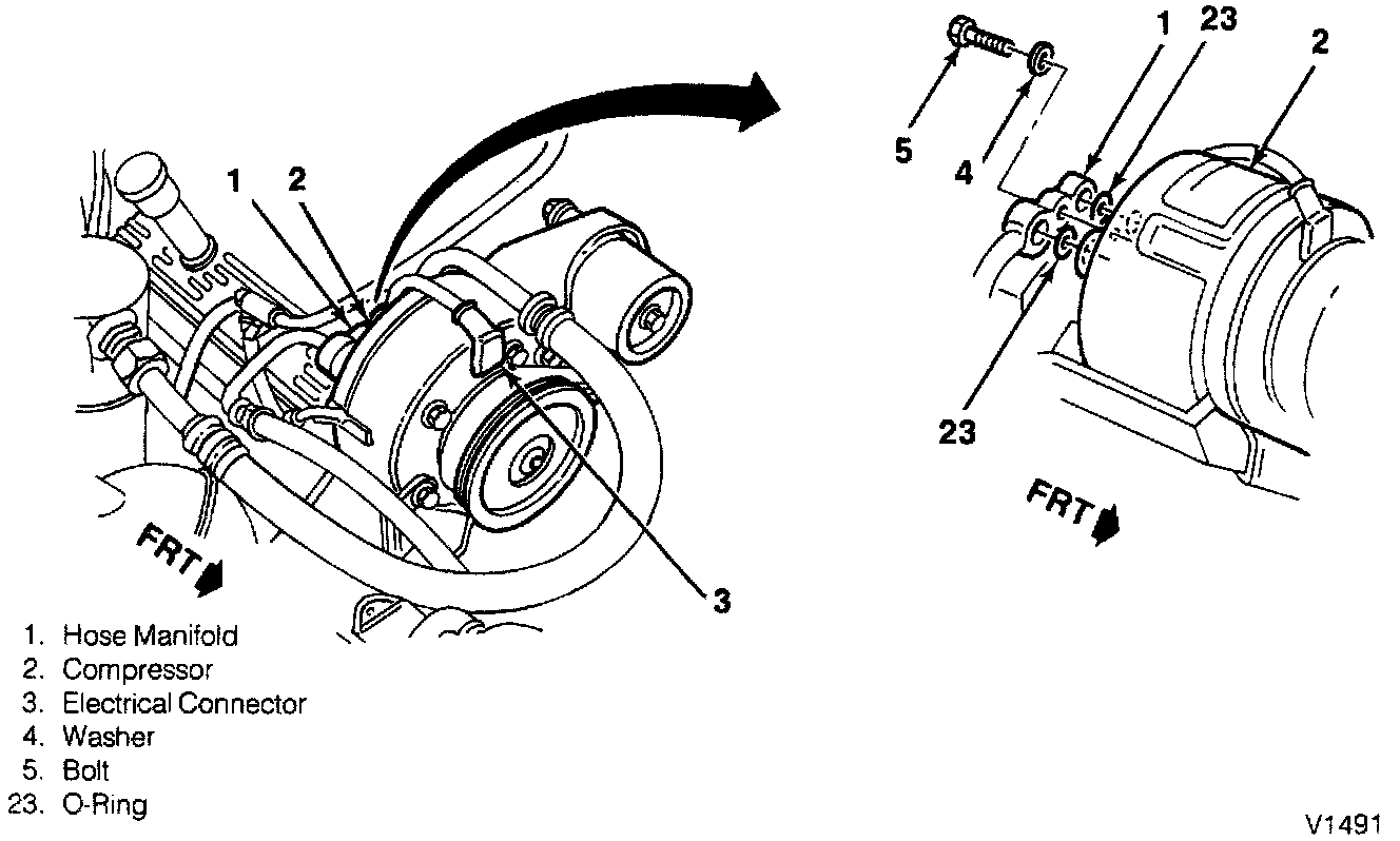 IMPORTANT: Oval cross-section O-rings (23) have been released to provide more effective sealing of the refrigerant line connections at the compressor rear head. New oval cross-section O-rings (23) should be used when installing the refrigerant hose manifold (1) to the compressor (2). The cavities for the O-rings (23) should be lubricated with clean refrigerant oil and the O-rings (23) should be pressed into place with a tool that will not damage the O-ring (23). A thin, smooth plastic rod with no sharp edges or points is an ideal tool for this purpose.