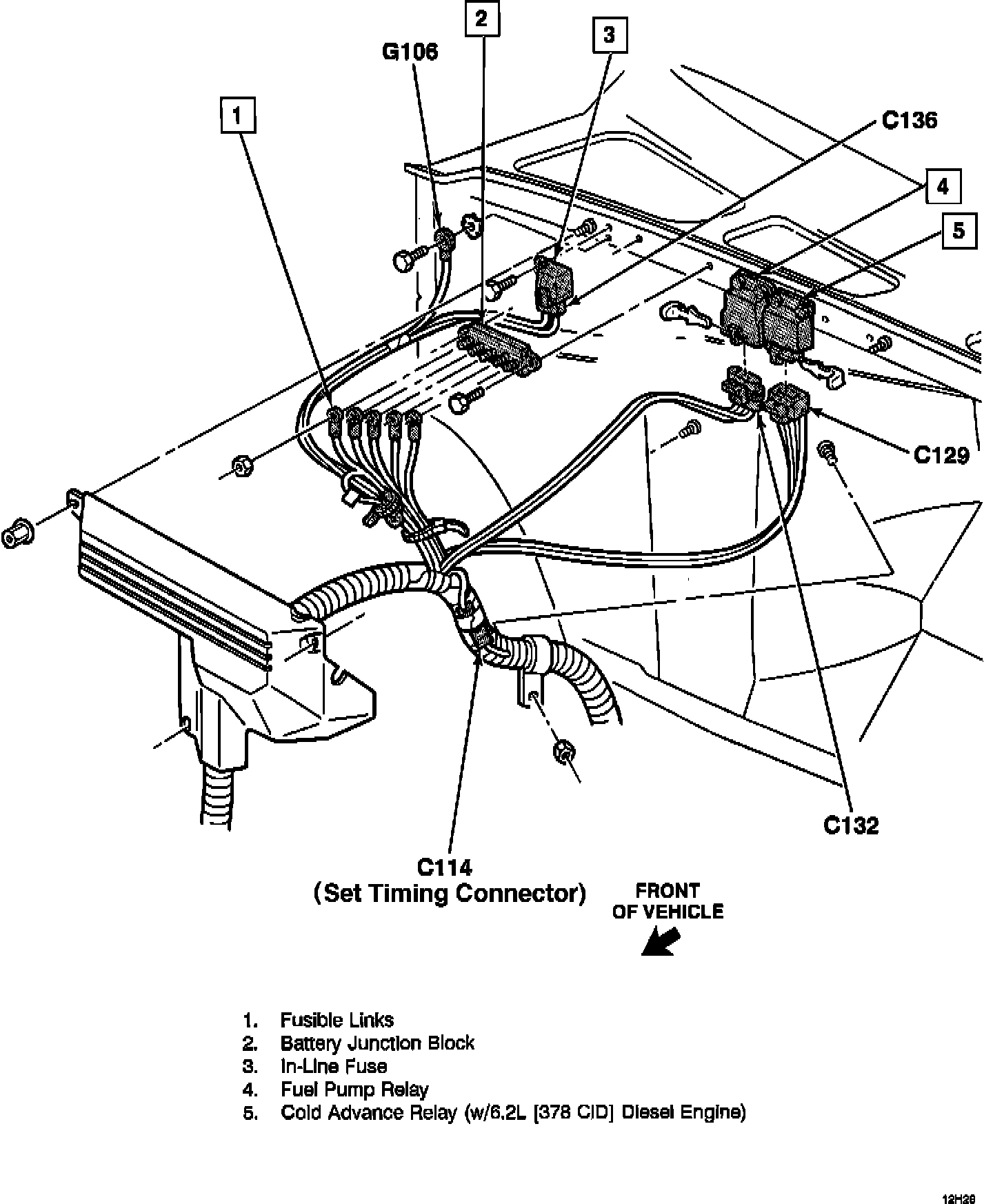 ^ Disconnect SET TIMING connector (C114, tan/black wire) located in center of cowl, under battery junction block cover. DO NOT disconnect 4 wire connector at distributor.