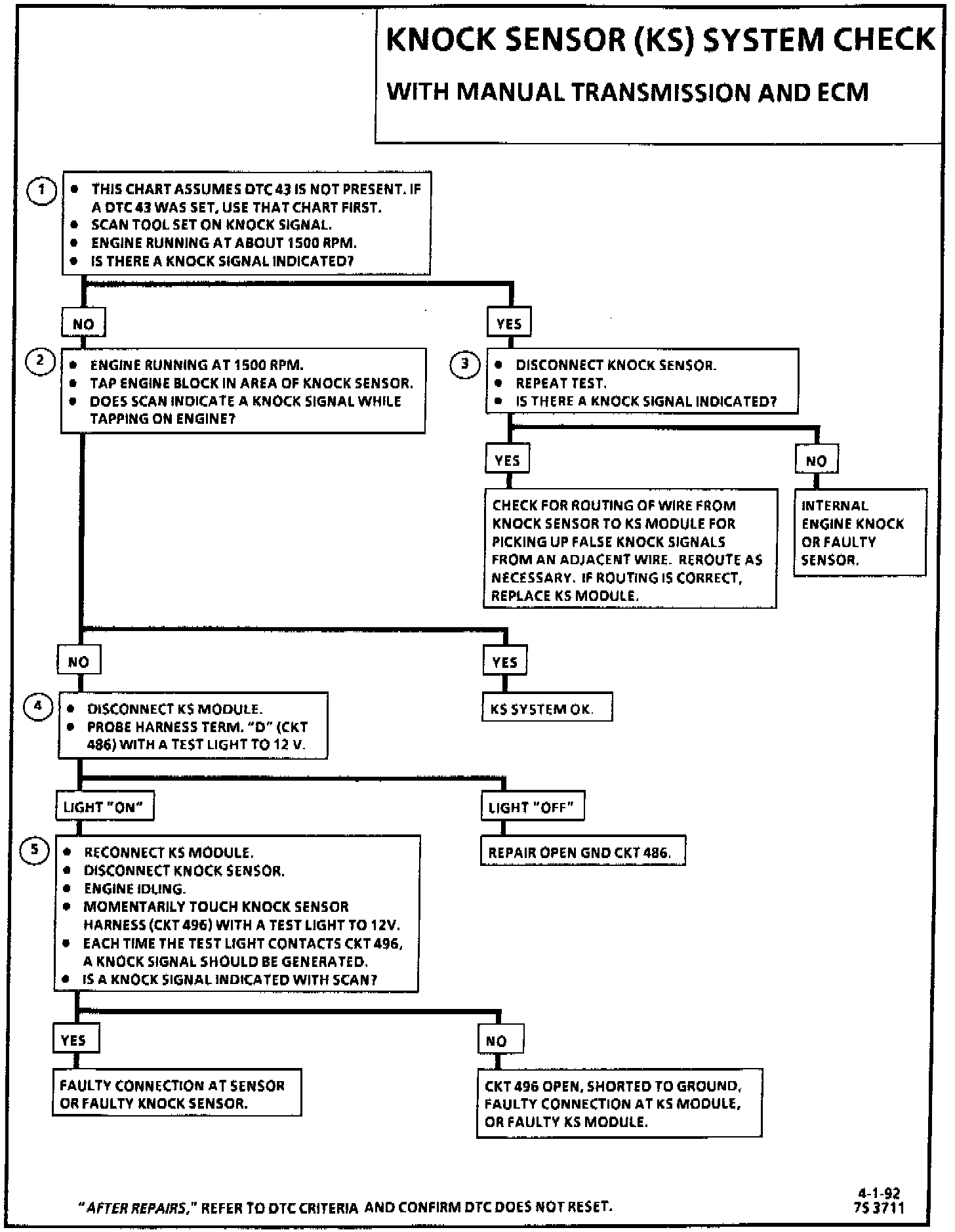 1. If a DTC 43 is not set, but a knock signal is indicated while operating at 1500 RPM, listen for an internal engine noise. Under a no load condition there should not be any detonation, if knock is indicated, an internal engine problem may exist.