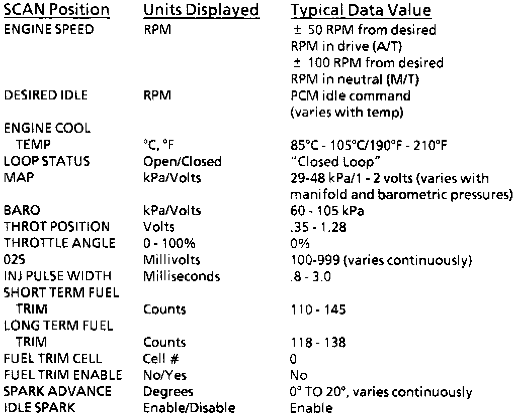 Typical Scan Data Values (1 of 2) - PCM: