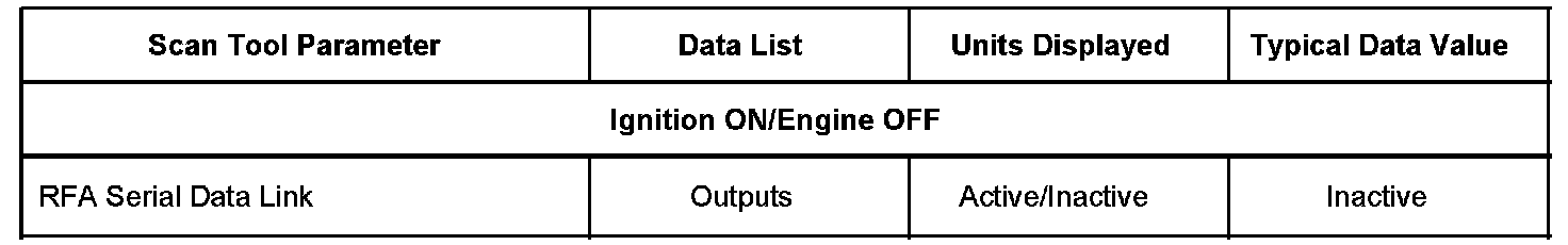 The Keyless Entry Scan Tool Data List contains all of the keyless entry related parameters that are available on the scan tool. The parameters in the list are arranged in alphabetical order. The column, "Data List," indicates the location of the parameter within the scan tool menu selections. Use the Keyless Entry Scan Tool Data List as directed by a diagnostic table or in order to supplement the diagnostic procedures. Begin all of the diagnostic procedures with Diagnostic System Check - Remote Keyless Entry.
