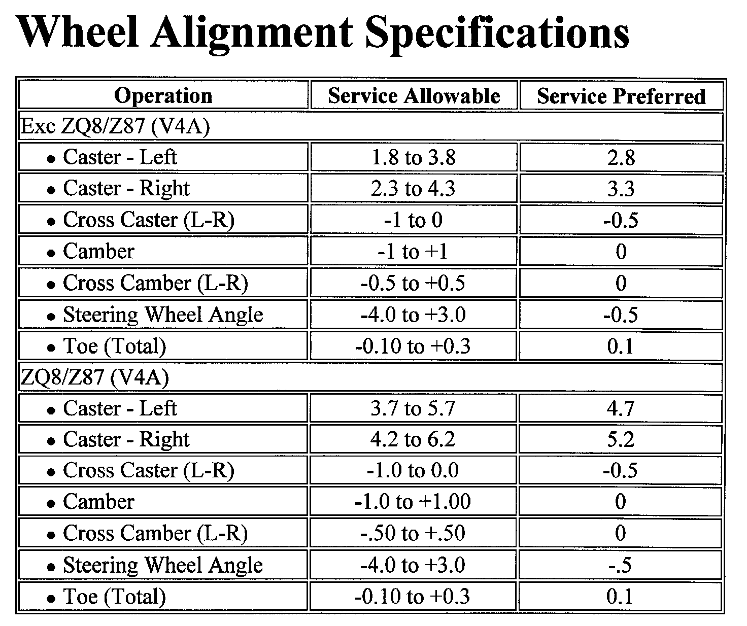 Wheel Alignment Specifications