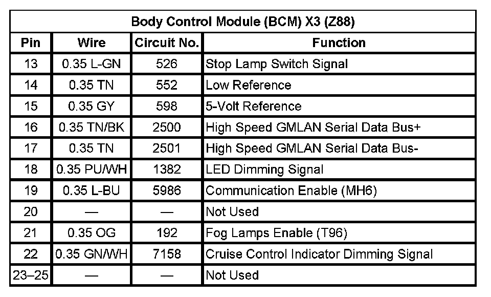 Body Control Module (BCM) X3 (With RPO Code Z88) Pin 13 To 25: