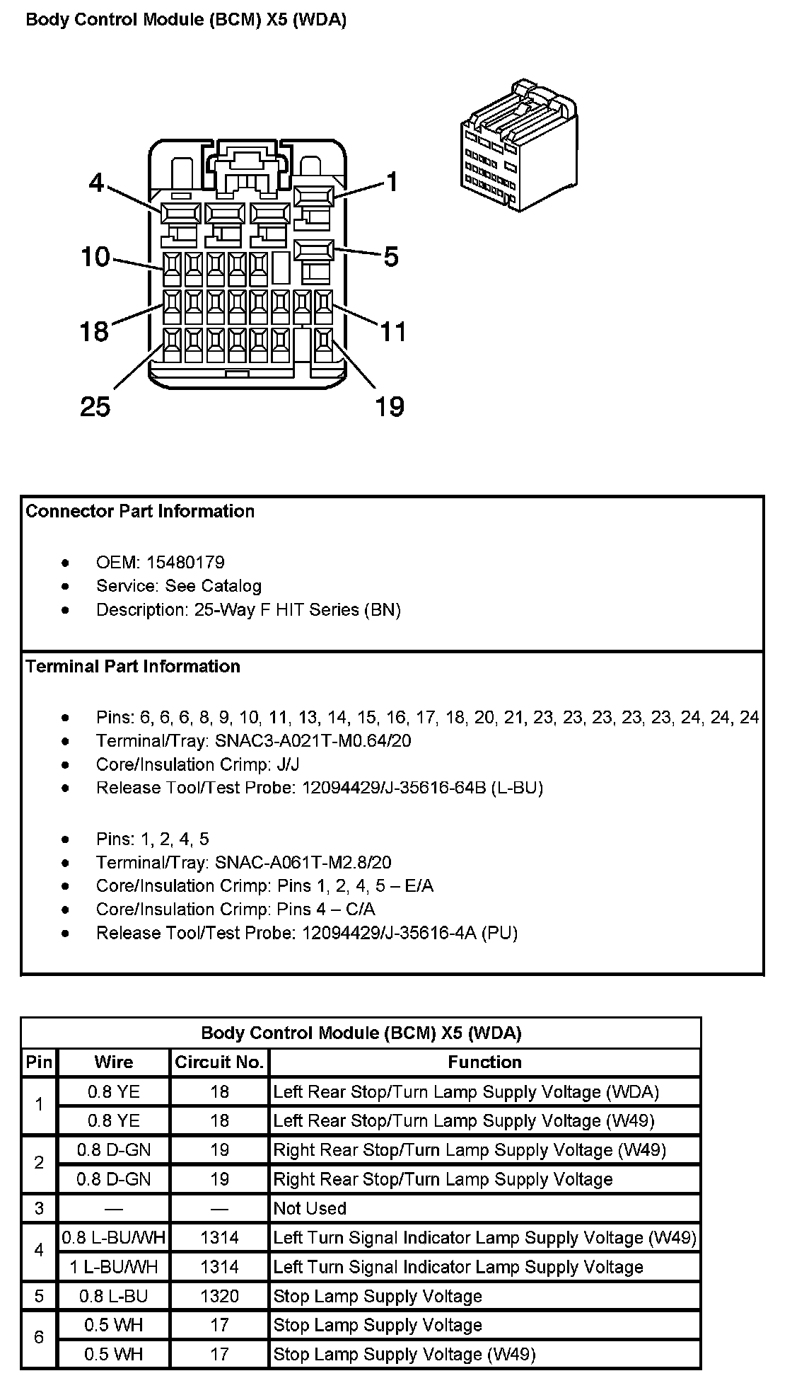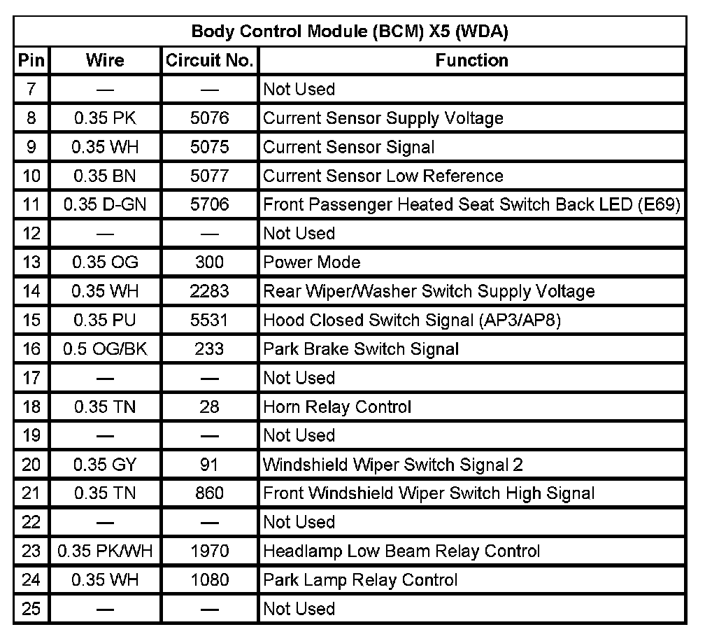 Body Control Module (BCM) X5 (With RPO Code WDA) Pin 7 To 25: