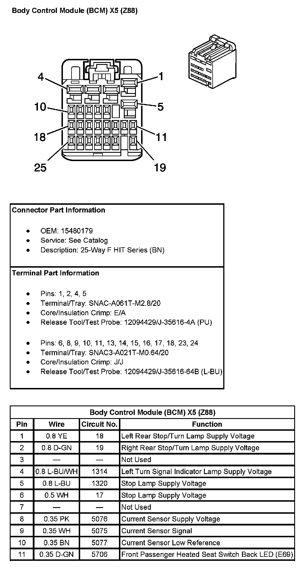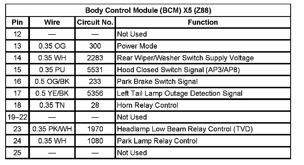 Body Control Module (BCM) X5 (With RPO Code Z88) Pin 12 To 25: