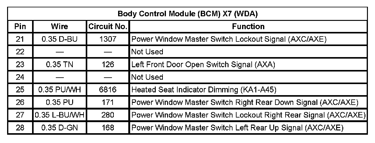 Body Control Module (BCM) X7 (With RPO Code WDA) Pin 21 To 28: