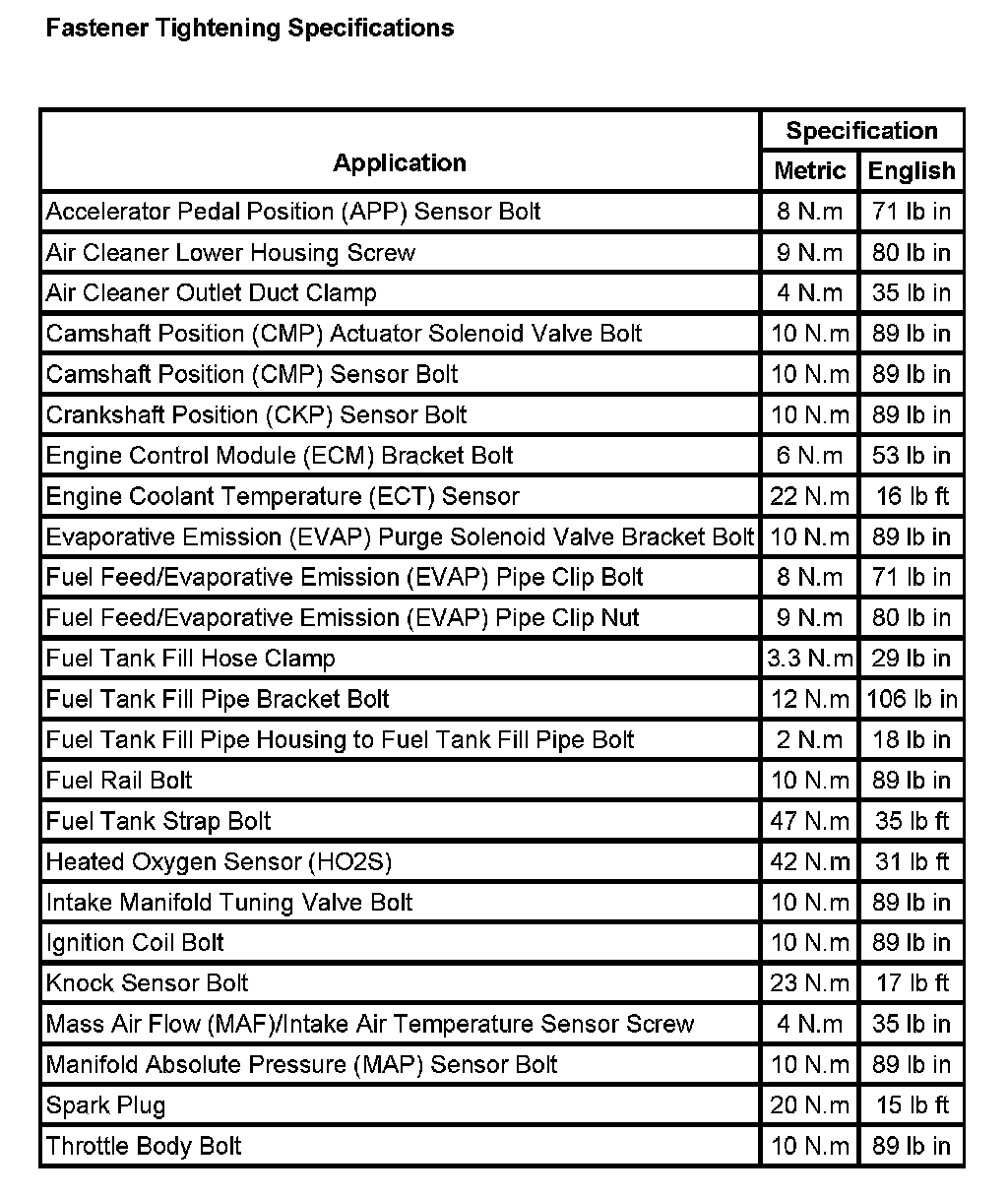 Fastener Tightening Specifications: